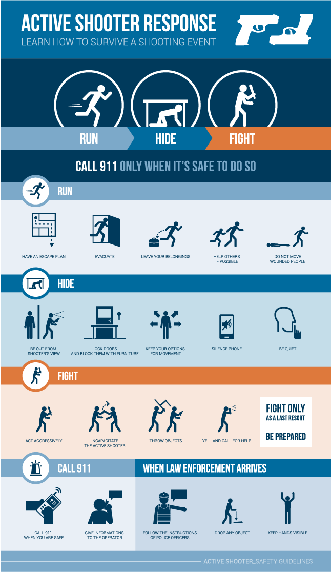 - Comply with police instructions. The first responding officers will be focusing on stopping the active shooter and creating a safe environment for medical assistance to be brought to the injured.