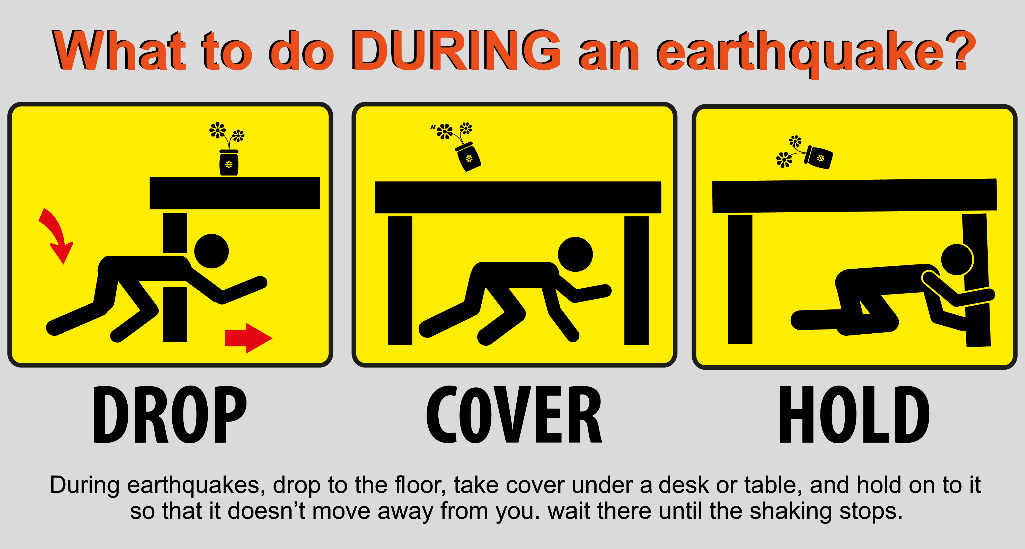 HOLD ON until the shaking stops. If there isn't a table or desk near you, cover your face and head with your arms and crouch in an inside corner of the building