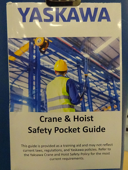 Many types of cranes, hoists, and rigging devices are used within Yaskawa America, Inc. for lifting and moving materials.