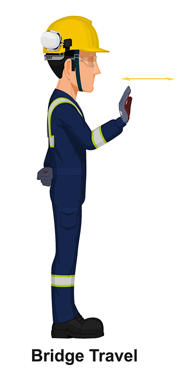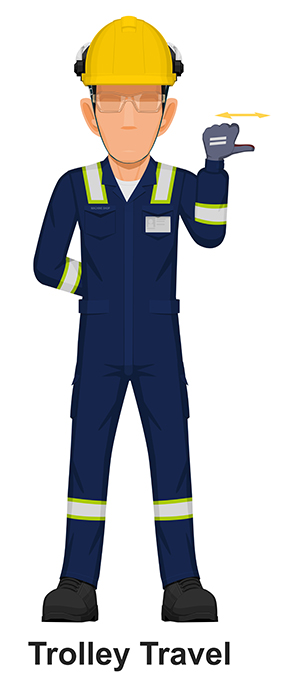 With multiple trolley cranes, used to indicate which hoist is being referenced. Hold up one finger for block marked "1" and two fingers for block marked "2". Regular hand signals follow.