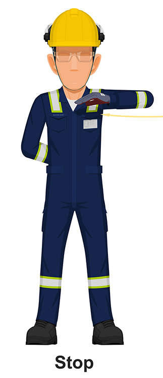 Arms stretched out (like baseball "safe" signal), then forearms brought to chest. Follow all Emergency Stop signals, regardless of who gives it.