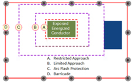 | Limited Approach Boundary | Shock protection boundary designed to keep nonqualified persons at a safe distance from exposed electrical components. Only qualified workers are allowed within this boundary. | |