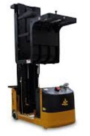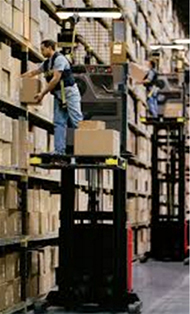 Order pickers are designed for the operator to travel to the height of the product to be stored or retrieved. Operators wear a fall protection lanyard.