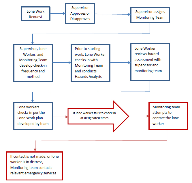 Hazard Analysis:Lone workers must review job hazard analyses (JHAs) before work and report any new hazards to the EHS department.
